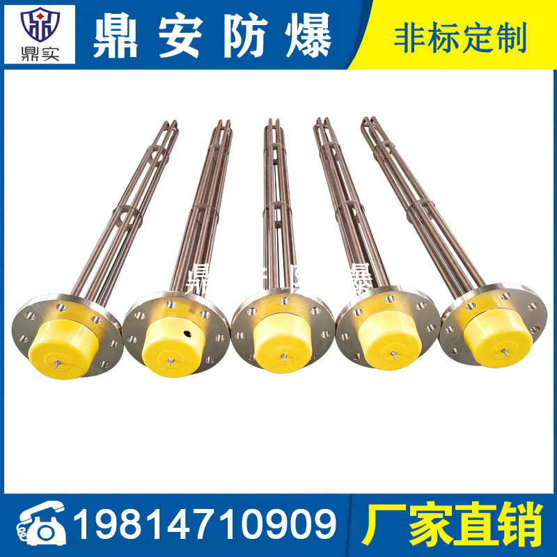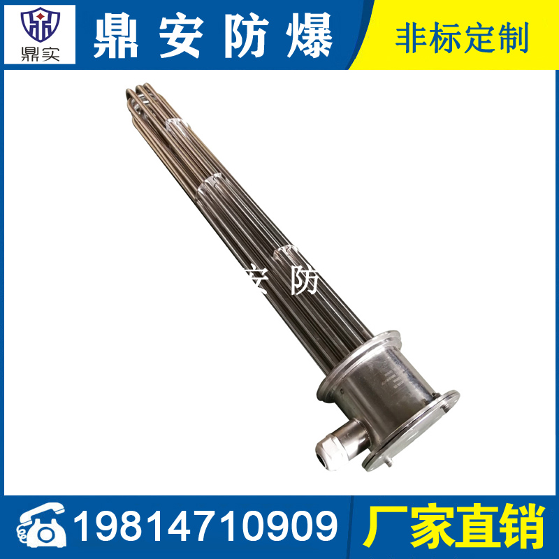 法蘭電熱管(也稱(chēng)插入式電加熱器):是采用U型管狀電熱元件,多支U型電熱管焊接在法蘭上集中加熱,依據(jù)加熱不同介質(zhì)設(shè)計(jì)規(guī)范,按照功率配置要求裝配在法蘭蓋上,插入需加熱物料中,發(fā)熱元件工作時(shí)所發(fā)出的大量熱量傳導(dǎo)給被加熱介質(zhì)使介質(zhì)溫度升高,達(dá)到所需的工藝要求,主要用于敞開(kāi)式、封閉式的溶液箱和循環(huán)系統(tǒng)中加熱用。