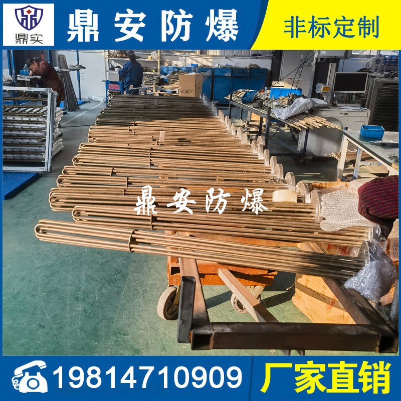 法蘭電熱管(也稱插入式電加熱器):是采用U型管狀電熱元件,多支U型電熱管焊接在法蘭上集中加熱,依據(jù)加熱不同介質(zhì)設(shè)計規(guī)范,按照功率配置要求裝配在法蘭蓋上,插入需加熱物料中,發(fā)熱元件工作時所發(fā)出的大量熱量傳導給被加熱介質(zhì)使介質(zhì)溫度升高,達到所需的工藝要求,主要用于敞開式、封閉式的溶液箱和循環(huán)系統(tǒng)中加熱用。