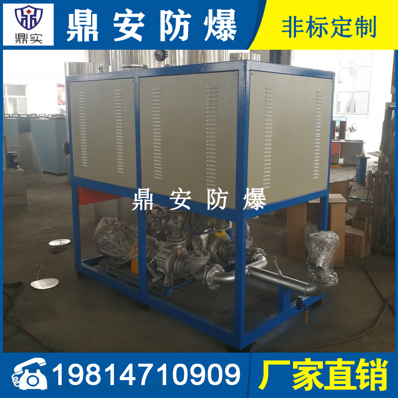 導熱油加熱機組(又稱電加熱導熱油爐)由防爆電加熱器、有機熱載體爐、換熱器(可配置)、控制柜,熱油泵、膨脹槽等組成一個整體的系統(tǒng),用戶只需要接入電源、介質(zhì)的進出口管道法蘭及一些電氣接口即可使用。具有完備的運行控制和安全監(jiān)測裝置,能實行自動化控制。能在較低的運行壓力下獲得較高的工作溫度。