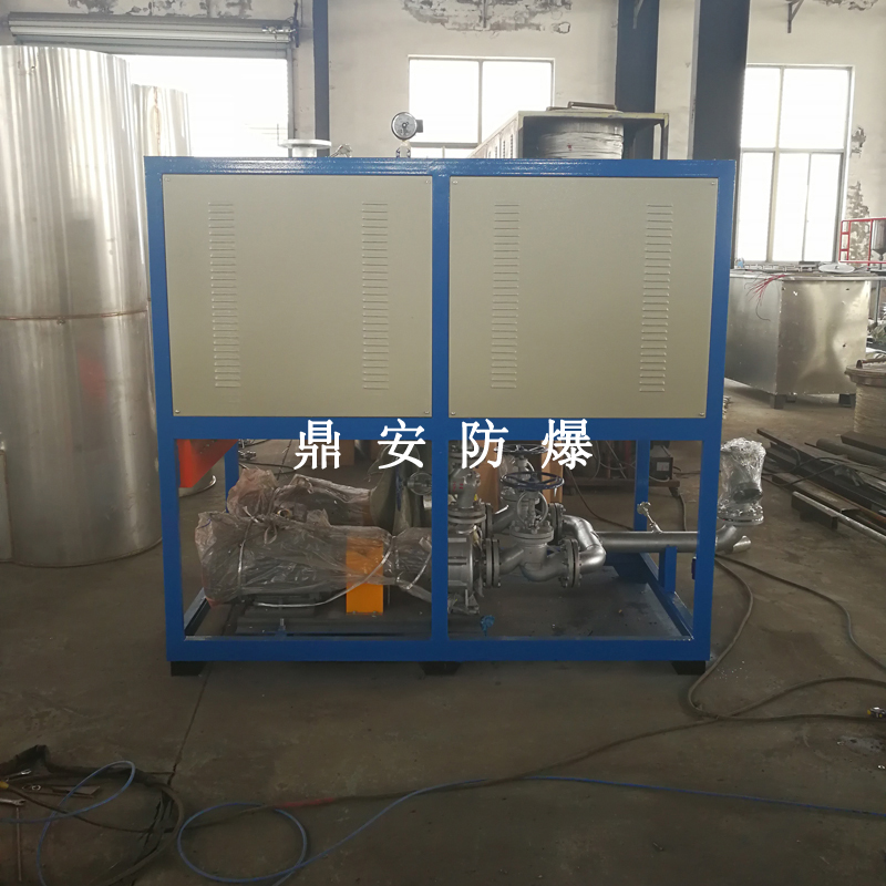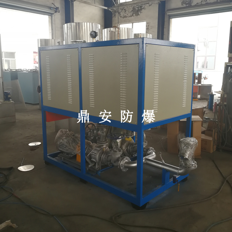 電加熱導熱油爐是將加熱元件直接插入有機載體(導熱油)中直接加熱,利用耐高溫循環(huán)泵,強制將導熱油進行液相循環(huán),將導熱油吸收的熱量傳遞給用一個或多種用熱設備,經(jīng)用熱設備把熱量卸載后,把導熱油重新通過循環(huán)泵,回到導熱油爐電加熱器加次加熱,再吸收量,傳遞給用熱設備,如此周而復始,實現(xiàn)熱量的連續(xù)傳遞,使被加熱物體溫度升高,達到加熱的工藝要求。