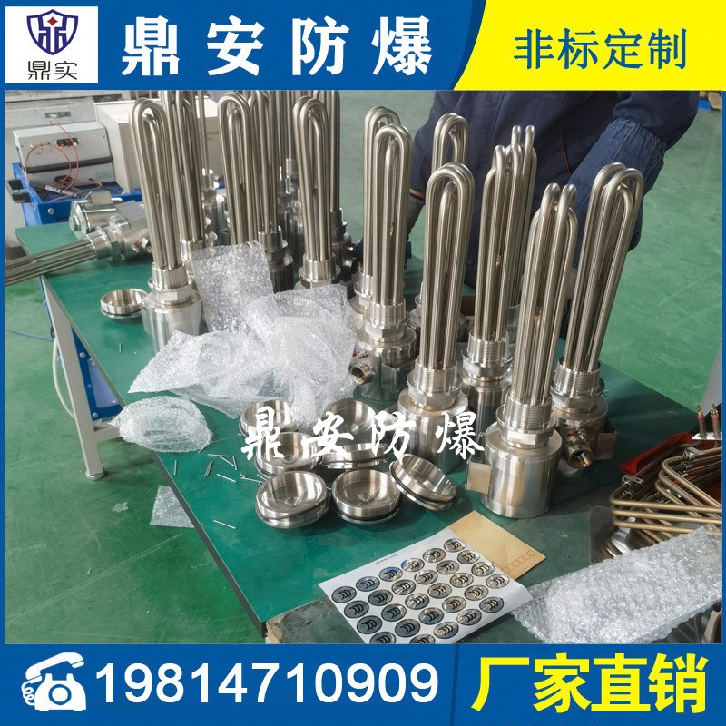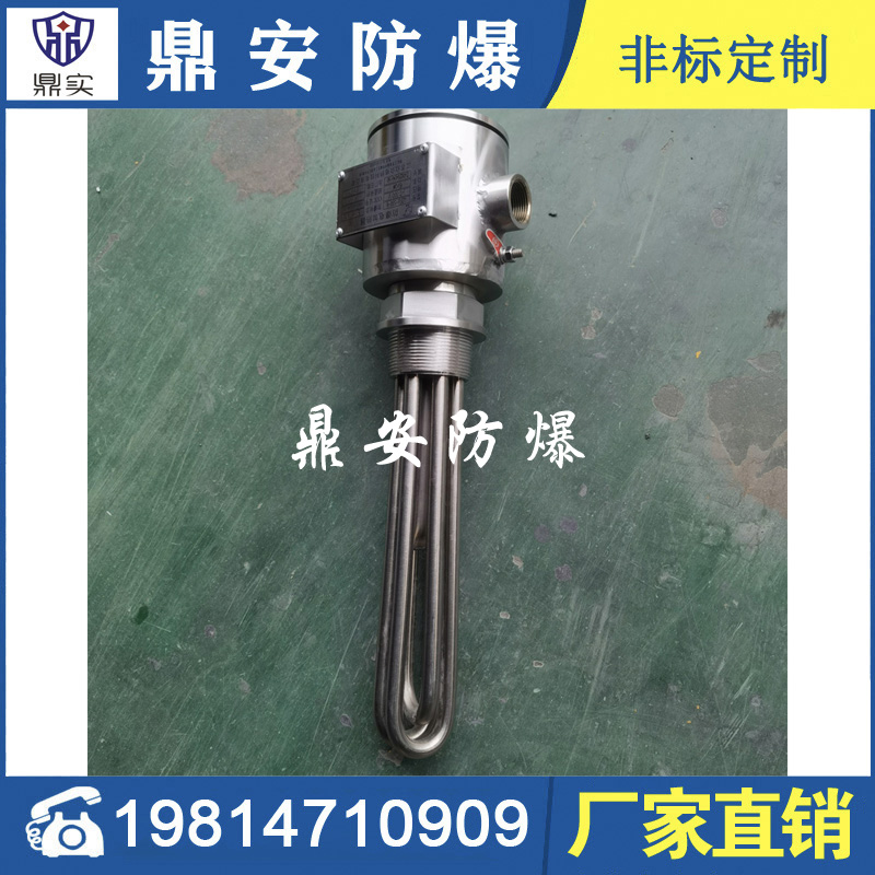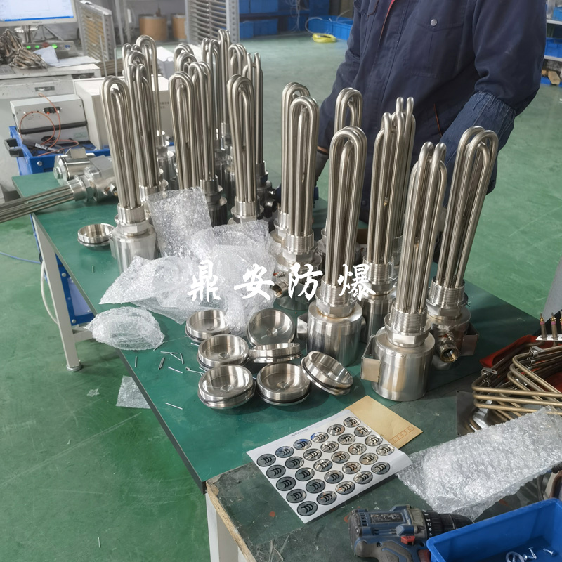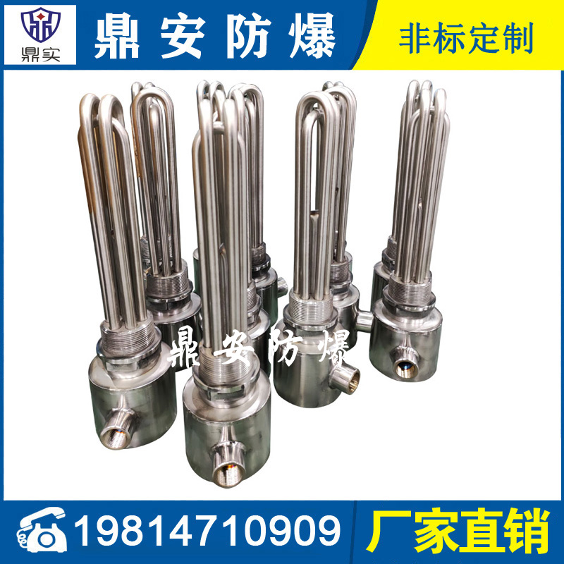 防爆法蘭加熱管是由多支加熱管焊接在法蘭上集中加熱。主要用于敞開式、封閉式的溶液箱和循環(huán)系統(tǒng)中加熱用。優(yōu)點: 表面功率大,使一般電加熱表面負荷的2~4倍,高度密集式、結構緊湊。由于整體短而密集,故穩(wěn)定性好,安裝無需支架。組合式法蘭加熱管大多采用氬弧焊接方式使電熱管于法蘭連接,也可利用緊固裝置的形式,即每支電熱管上焊由緊固件。然后與法蘭蓋采用螺母鎖緊。管子于緊固件采用氬弧焊接。緊固件密封處采用科學的工藝。單支更換方便,大大節(jié)約以后的維修成本選擇進口及國內優(yōu)質材料??茖W的生產工藝,嚴格的質量管理,保證電熱管優(yōu)越的電氣性能。