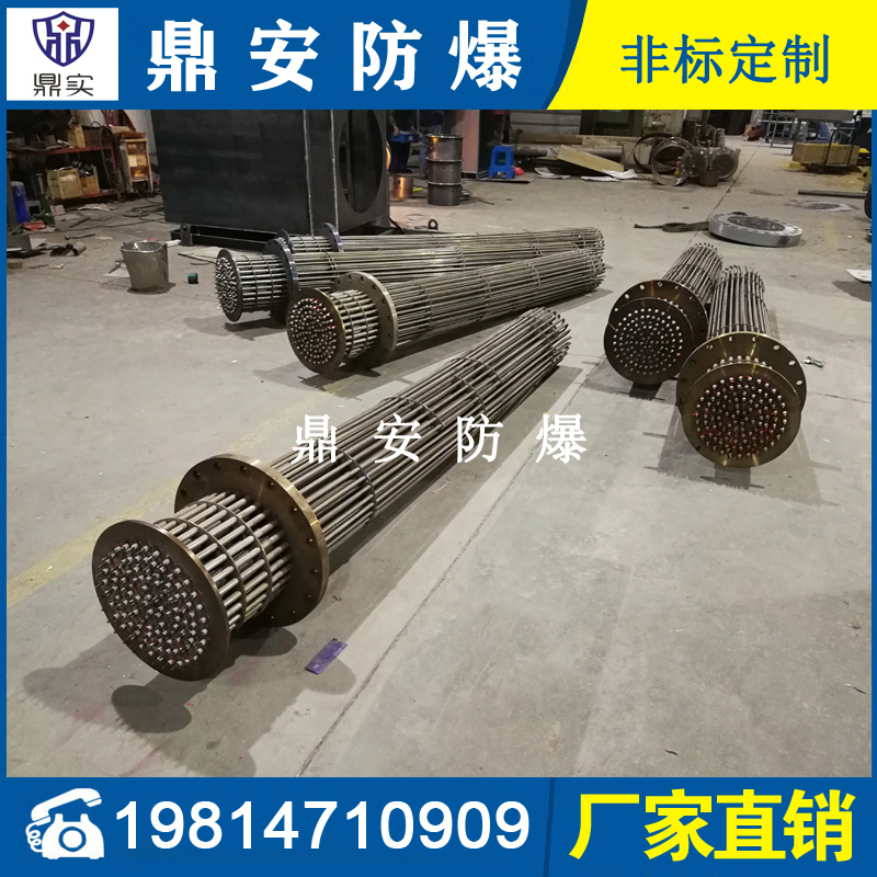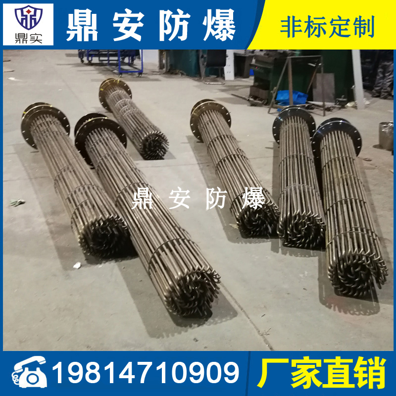 防爆法蘭加熱管是由多支加熱管焊接在法蘭上集中加熱。主要用于敞開式、封閉式的溶液箱和循環(huán)系統(tǒng)中加熱用。優(yōu)點: 表面功率大,使一般電加熱表面負荷的2~4倍,高度密集式、結(jié)構(gòu)緊湊。由于整體短而密集,故穩(wěn)定性好,安裝無需支架。組合式法蘭加熱管大多采用氬弧焊接方式使電熱管于法蘭連接,也可利用緊固裝置的形式,即每支電熱管上焊由緊固件。然后與法蘭蓋采用螺母鎖緊。管子于緊固件采用氬弧焊接。漏緊固件密封處采用科學的工藝。單支更換方便,大大節(jié)約以后的維修成本選擇進口及國內(nèi)優(yōu)質(zhì)材料??茖W的生產(chǎn)工藝,嚴格的質(zhì)量管理,保證電熱管優(yōu)越的電氣性能。