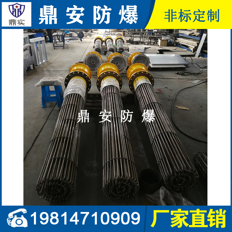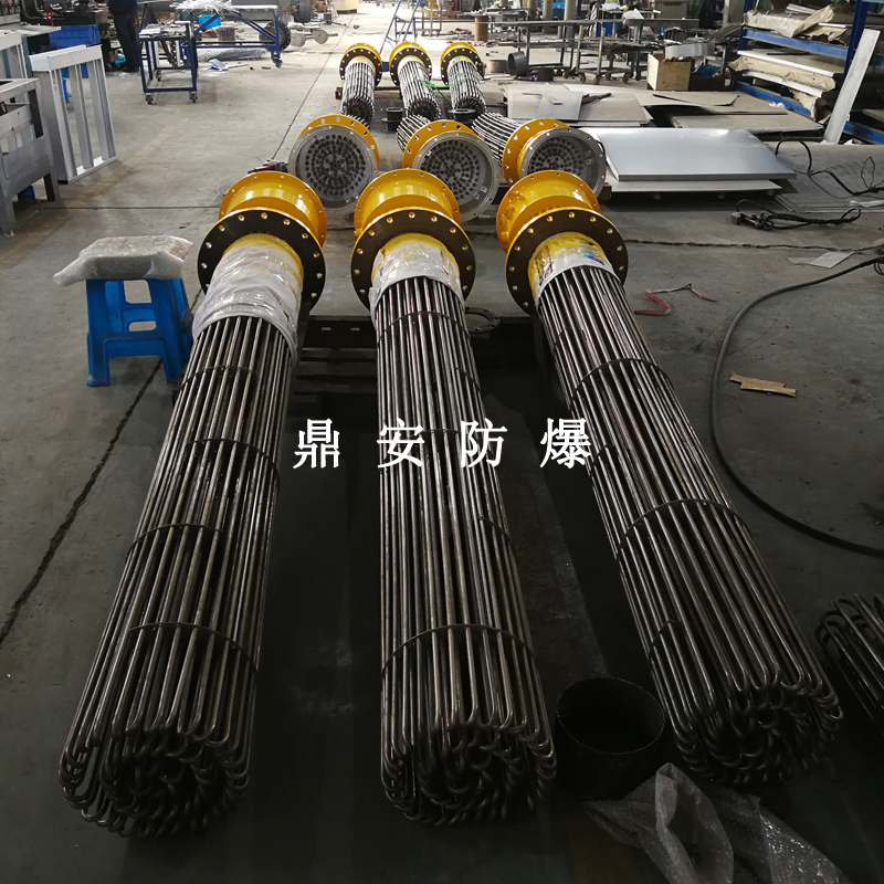防爆法蘭電加熱管(也稱插入式電加熱器):是采用U型管狀電熱元件,依據(jù)加熱不同介質(zhì)設計規(guī)范,按照功率配置要求裝配在法蘭蓋上,插入需加熱物料中,發(fā)熱元件工作時所發(fā)出的大量熱量傳導給被加熱介質(zhì)使介質(zhì)溫度升高,達到所需的工藝要求。當介質(zhì)溫度達到工藝要求的設定值時,控制系統(tǒng)根據(jù)溫度傳感器信號,經(jīng)PID 運算后調(diào)節(jié)電加熱器輸出功率,對發(fā)熱元件的電阻性負載實現(xiàn)溫度控制。使介質(zhì)溫度均勻,達到所需要求;當發(fā)熱元件超溫或低液位時,發(fā)熱元件的聯(lián)鎖保護裝置立即切斷加熱電源避免發(fā)熱元件燒壞,延長使用壽命。