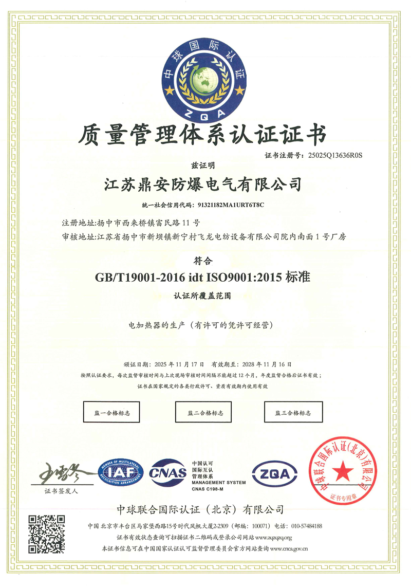 江蘇鼎安防爆電氣有限公司是一家生產(chǎn)和銷售高品質(zhì)電加熱設(shè)備的民營企業(yè)。擁有成套完善的生產(chǎn)設(shè)備和一支技術(shù)力量雄厚的研發(fā)及生產(chǎn)隊伍。主要生產(chǎn)環(huán)保節(jié)能的PTC電加熱器、防爆導(dǎo)熱油爐電加熱器、防爆管道加熱器、防爆風道加熱器、單頭加熱管、雙頭加熱管、翅片加熱管、防爆法蘭加熱管等。并為國內(nèi)多家大型科研機構(gòu)及出口企業(yè)配套生產(chǎn)各種電加熱設(shè)備。