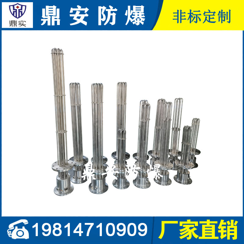 防爆法蘭加熱管是由多支加熱管焊接在法蘭上集中加熱。主要用于敞開式、封閉式的溶液箱和循環(huán)系統(tǒng)中加熱用。優(yōu)點(diǎn): 表面功率大,使一般電加熱表面負(fù)荷的2~4倍,高度密集式、結(jié)構(gòu)緊湊。由于整體短而密集,故穩(wěn)定性好,安裝無需支架。組合式法蘭加熱管大多采用氬弧焊接方式使電熱管于法蘭連接,也可利用緊固裝置的形式,即每支電熱管上焊由緊固件。然后與法蘭蓋采用螺母鎖緊。管子于緊固件采用氬弧焊接。緊固件密封處采用科學(xué)的工藝。單支更換方便,大大節(jié)約以后的維修成本選擇進(jìn)口及國內(nèi)優(yōu)質(zhì)材料??茖W(xué)的生產(chǎn)工藝,嚴(yán)格的質(zhì)量管理,保證電熱管優(yōu)越的電氣性能。