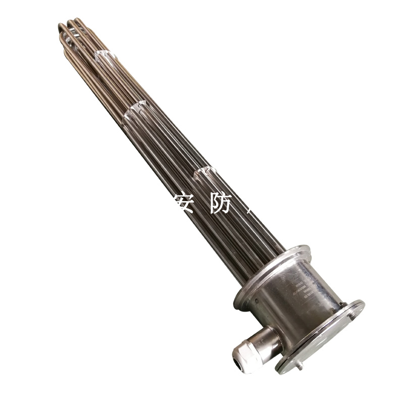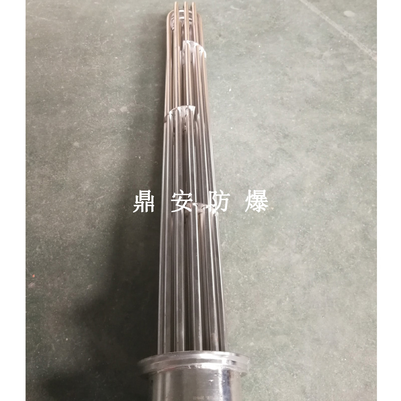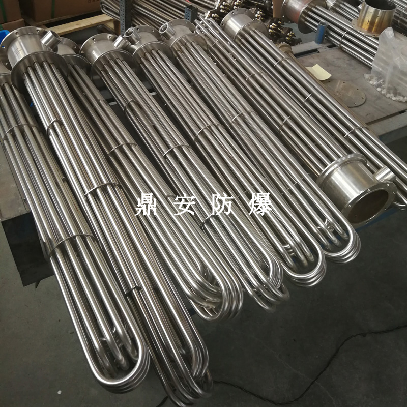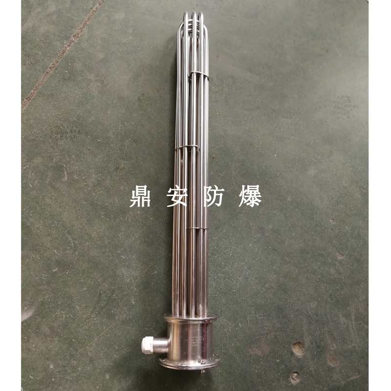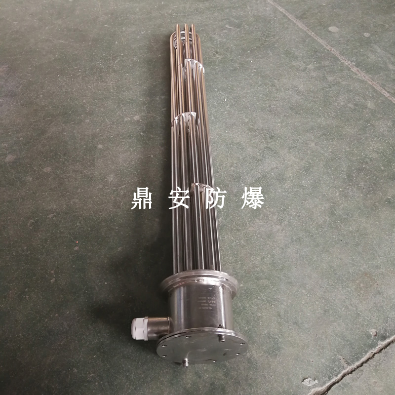 法蘭電熱管(也稱插入式電加熱器):是采用U型管狀電熱元件,多支U型電熱管焊接在法蘭上集中加熱,依據(jù)加熱不同介質(zhì)設(shè)計規(guī)范,按照功率配置要求裝配在法蘭蓋上,插入需加熱物料中,發(fā)熱元件工作時所發(fā)出的大量熱量傳導(dǎo)給被加熱介質(zhì)使介質(zhì)溫度升高,達到所需的工藝要求,主要用于敞開式、封閉式的溶液箱和循環(huán)系統(tǒng)中加熱用。