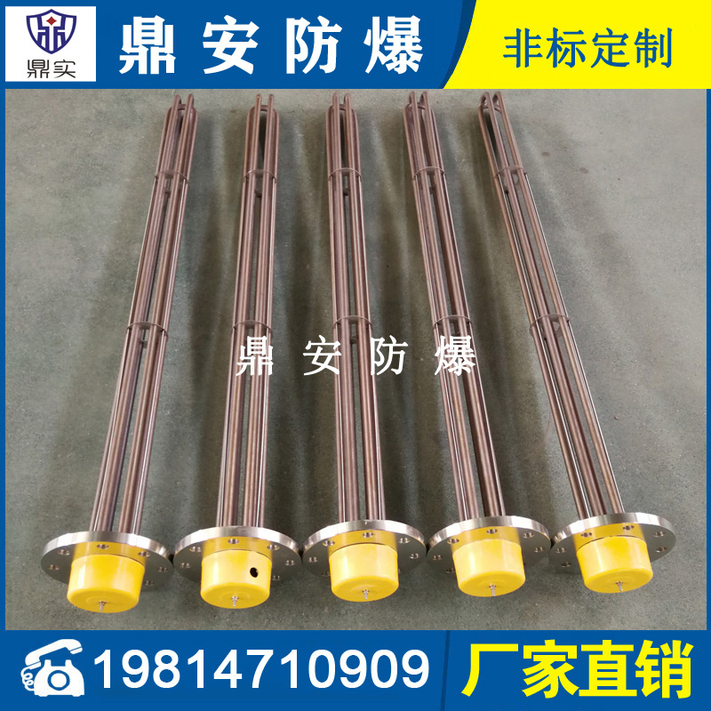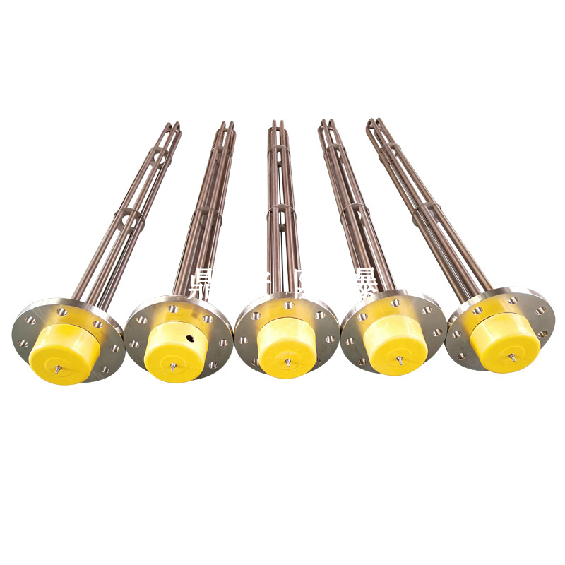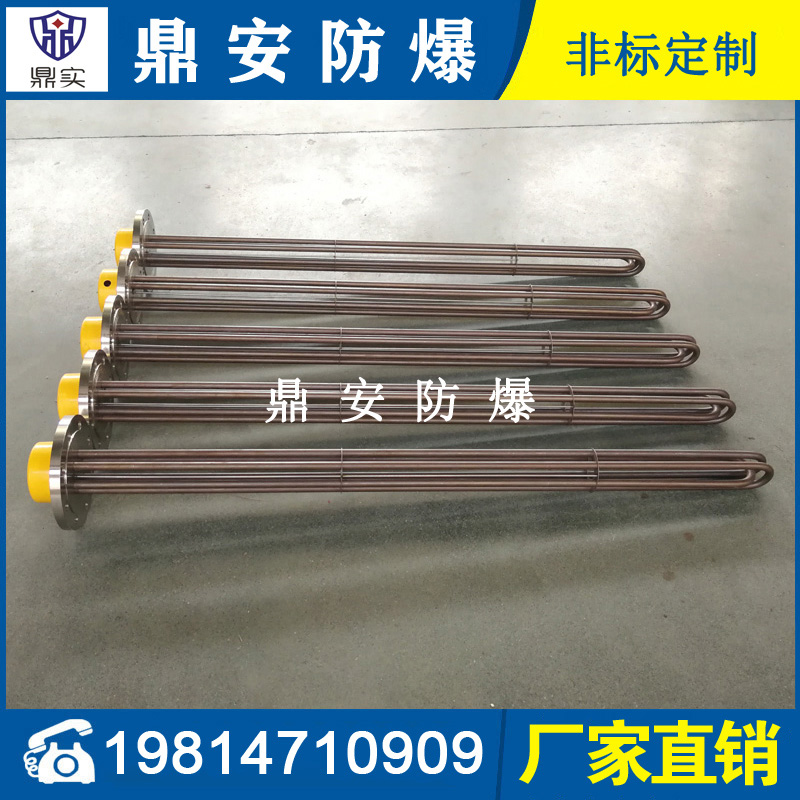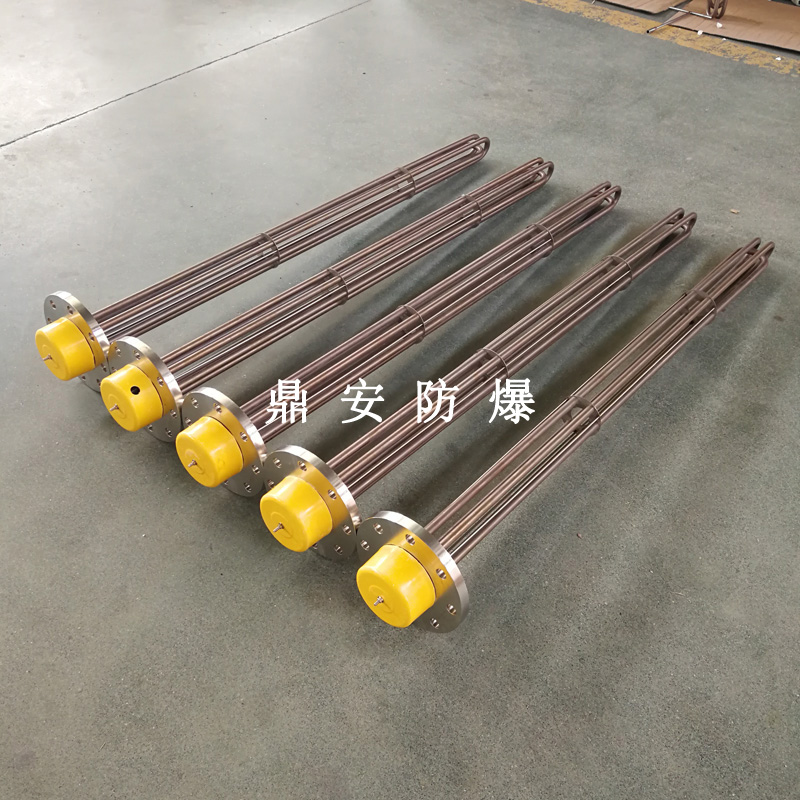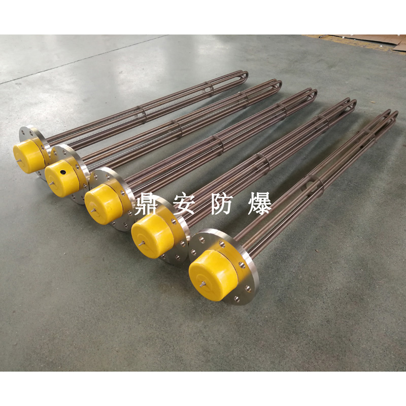 法蘭電熱管(也稱插入式電加熱器):是采用U型管狀電熱元件,多支U型電熱管焊接在法蘭上集中加熱,依據(jù)加熱不同介質(zhì)設(shè)計規(guī)范,按照功率配置要求裝配在法蘭蓋上,插入需加熱物料中,發(fā)熱元件工作時所發(fā)出的大量熱量傳導(dǎo)給被加熱介質(zhì)使介質(zhì)溫度升高,達(dá)到所需的工藝要求,主要用于敞開式、封閉式的溶液箱和循環(huán)系統(tǒng)中加熱用。