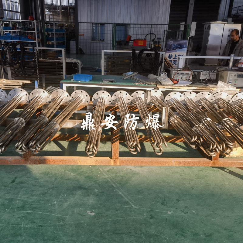 法蘭電熱管(也稱插入式電加熱器):是采用U型管狀電熱元件,多支U型電熱管焊接在法蘭上集中加熱,依據(jù)加熱不同介質(zhì)設(shè)計規(guī)范,按照功率配置要求裝配在法蘭蓋上,插入需加熱物料中,發(fā)熱元件工作時所發(fā)出的大量熱量傳導給被加熱介質(zhì)使介質(zhì)溫度升高,達到所需的工藝要求,主要用于敞開式、封閉式的溶液箱和循環(huán)系統(tǒng)中加熱用。